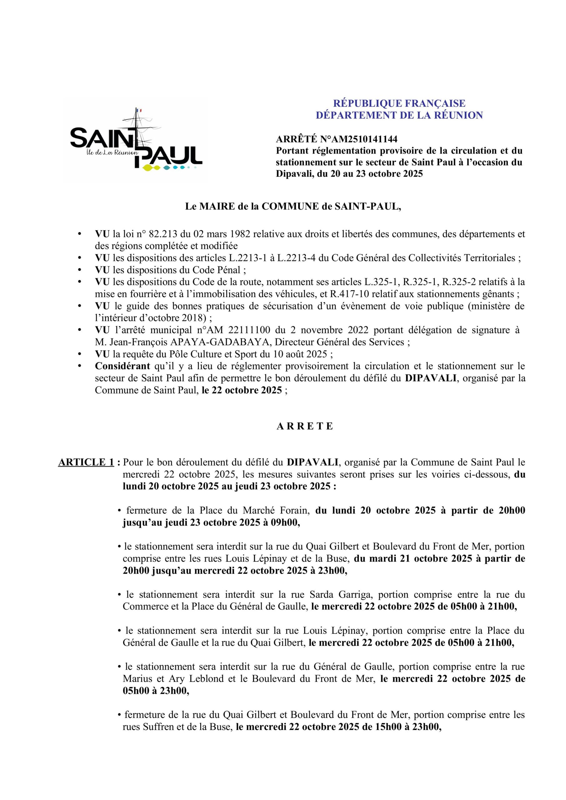 Information circulation et stationnement à Saint-Paul : mesures provisoires du 20 au 23 octobre 2025 à l’occasion du défilé de Dipavali.